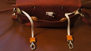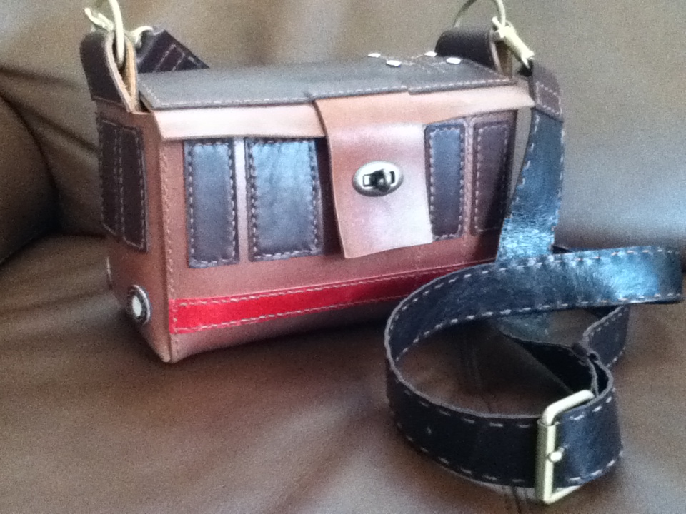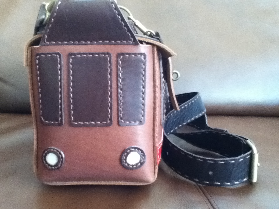 ラインの赤以外は濃い目の茶を多用し、ライトはラメ入りの牛革使用。